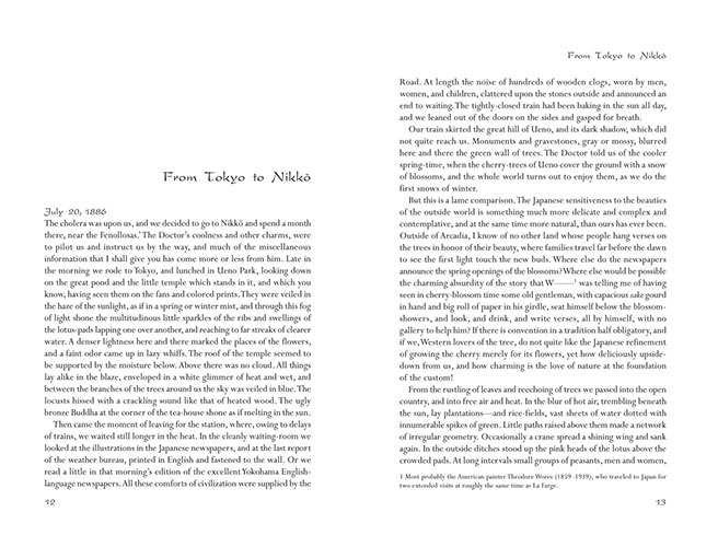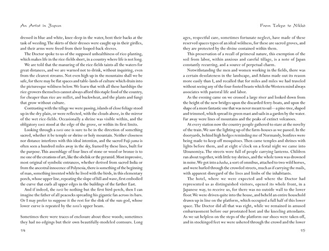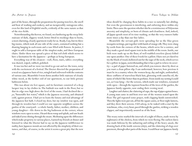 An Artist in Japan is full of sensitive descriptions, of the pleasant domesticity of city life, of the hustle and bustle on Japan’s great thoroughfares, of everyday people going about their everyday lives. It is a marvelous panoramic view of a Japan still firmly rooted in its traditions, but already in the thrall of Westernization. It is, in short, a work of art.