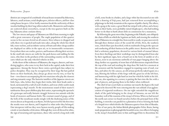 Perhaps the most fascinating part of Humbert’s account are his many forays around feudal Edo: to the Daimyôkôji, the “Warlord Aly,” with its grand mansions of Japan’s feudal lords; to the bustling mercantile district of Nihonbashi; to the temple district of Asakusa; and to Shin-Yoshiwara, the newly-erected licenced quarters on the city’s northern outskirts.