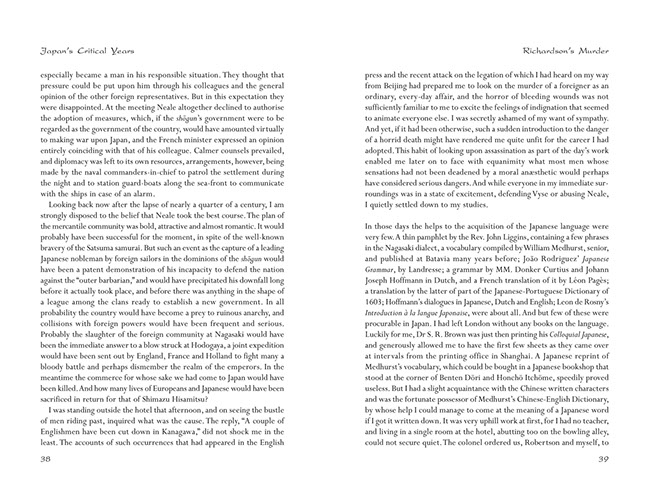 Ernest Mason Satow (1843–1929), a British scholar, diplomat and Japanologist, spent his young years as a translator and interpreter at the British Japan Consular Service between 1862 and 1883. Arriving in Yokohama in the wake of the Namamugi Incident, in which a British merchant was cut down from his horse along the Tôkaidô by samurai. Satow’s life in Japan becomes a long string of adventures in which he often finds himself at the center of events.