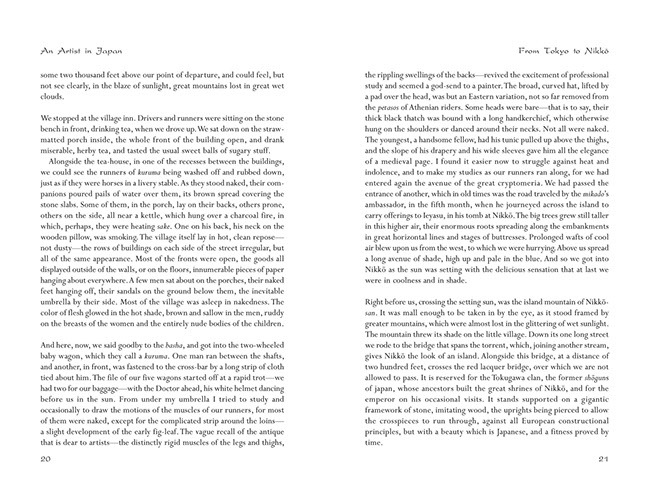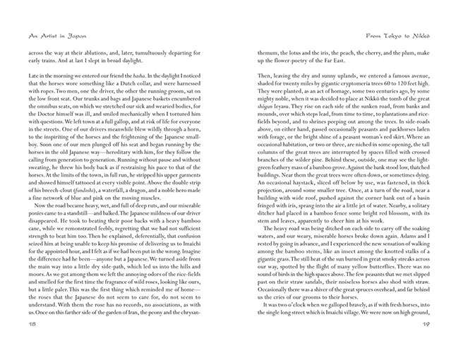 An Artist in Japan is full of sensitive descriptions, of the pleasant domesticity of city life, of the hustle and bustle on Japan’s great thoroughfares, of everyday people going about their everyday lives. It is a marvelous panoramic view of a Japan still firmly rooted in its traditions, but already in the thrall of Westernization. It is, in short, a work of art.