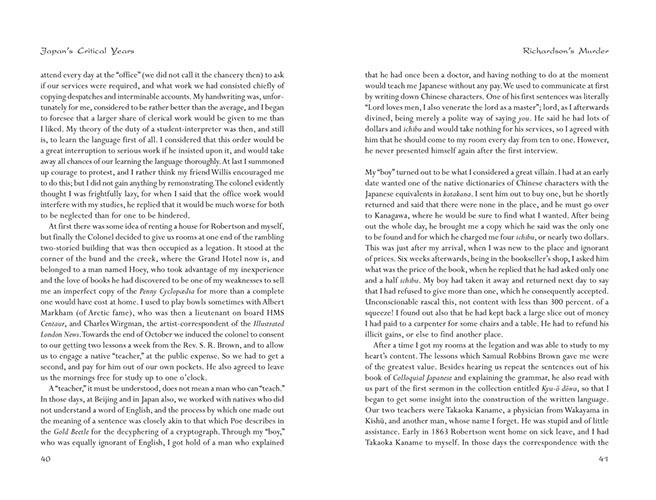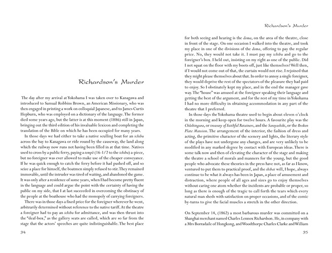Ernest Mason Satow (1843–1929), a British scholar, diplomat and Japanologist, spent his young years as a translator and interpreter at the British Japan Consular Service between 1862 and 1883. Arriving in Yokohama in the wake of the Namamugi Incident, in which a British merchant was cut down from his horse along the Tôkaidô by samurai. Satow’s life in Japan becomes a long string of adventures in which he often finds himself at the center of events.