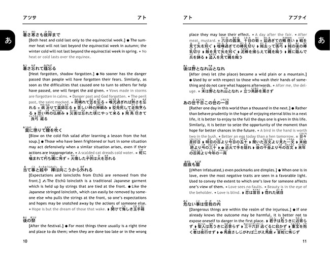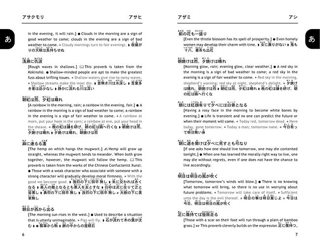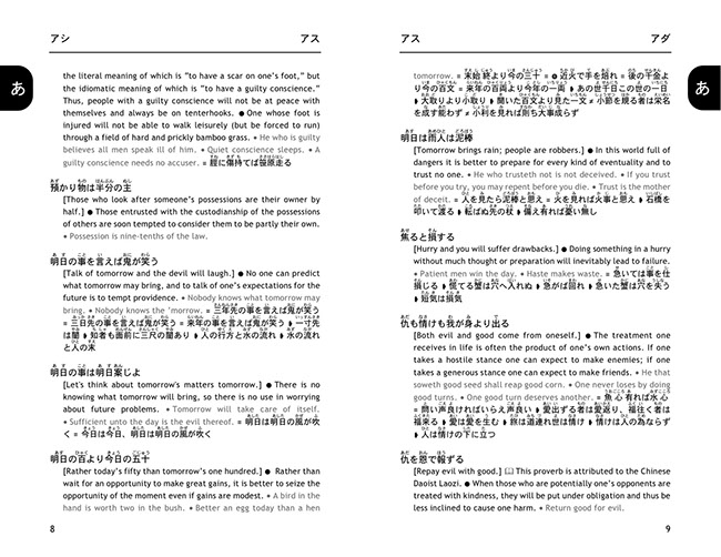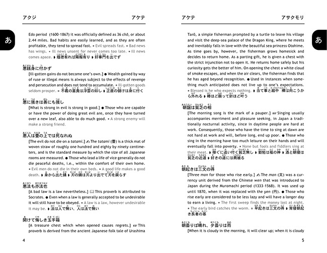 A companion volume to A Dictionary of Japanese Idioms, it presents more than 1000 entries, including many hundreds of proverbs that have never been presented and explained in English before. Explanations are given in succinct and lucid prose, and English equivalents are given whenever applicable. Each entry furthermore contains a literal translation to help bring out the nuances of the Japanese original, and where necessary, explanatory notes on grammar and historical background help deepen the reader’s understanding of a proverb’s meaning and context. Extensive cross-referencing allows the user to immediately find synonyms and antonyms, as well as related proverbs, while furigana allows even beginners to read and use the proverbs immediately. A thumb index makes entries exceptionally easy to access.