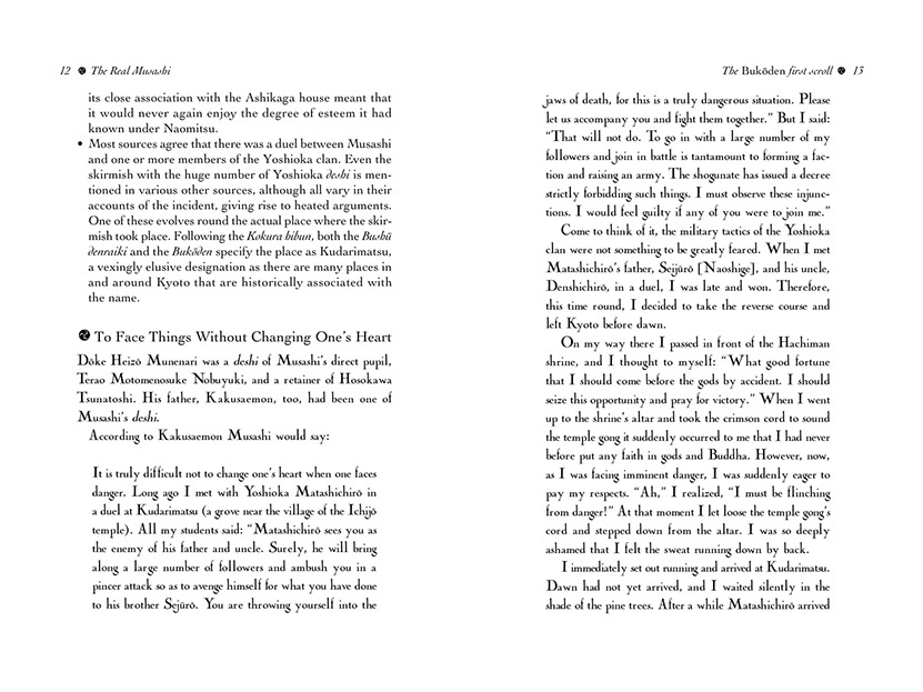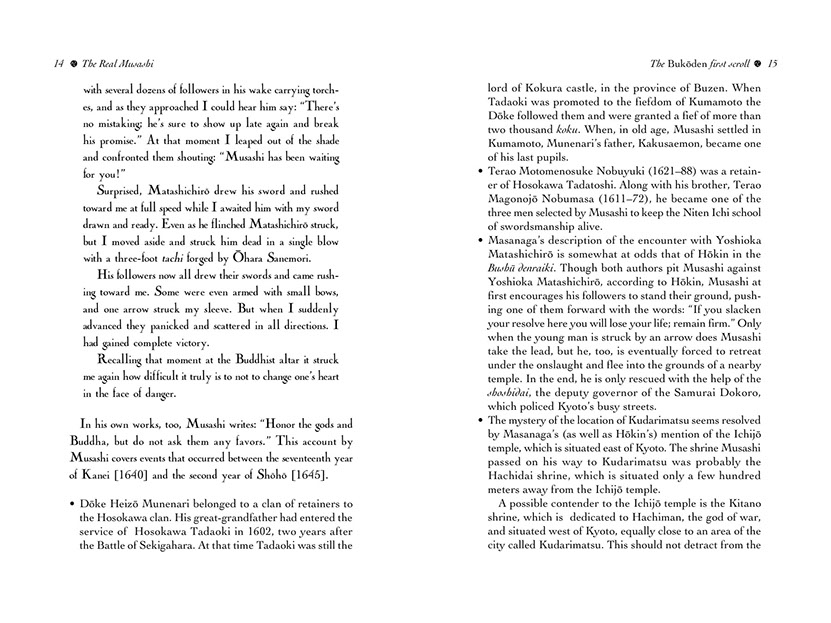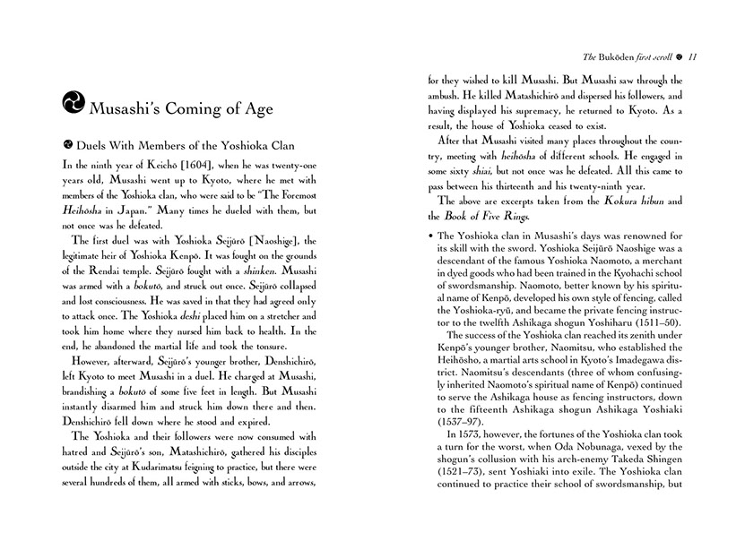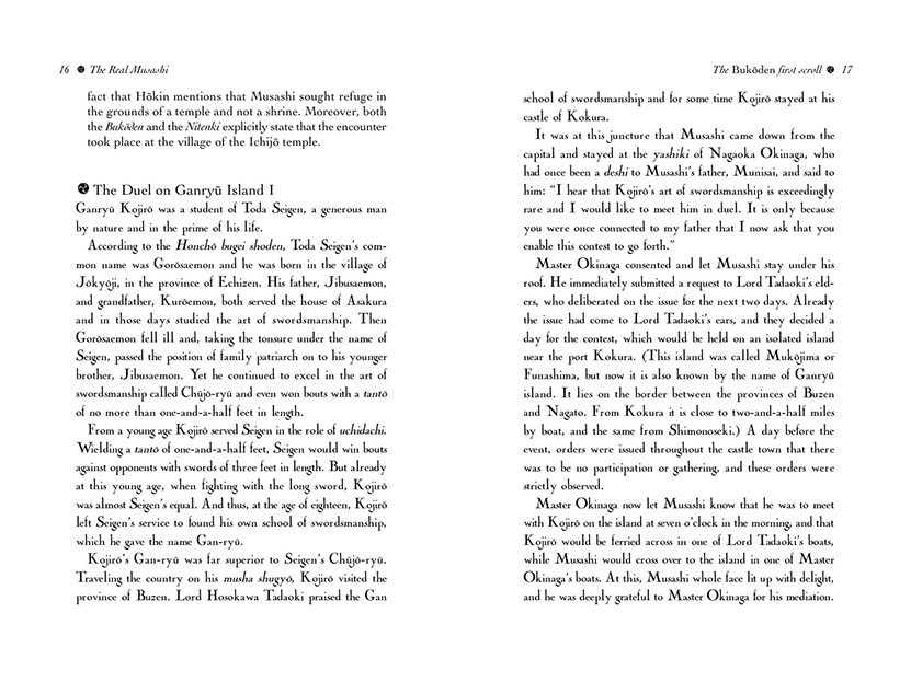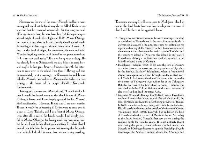 Now, for the first time in two-and-a-half centuries, Masanaga's insight into this enigmatic and solitary swordsman is available to the English reader. It throws a new and refreshing light on many aspects of especially Musashi's later life—his adoption of Iori, his return to Kyushu in 1634, and of course the gestation of his great work on the philosophy and art of Japanese swordsmanship, the Book of Five Rings.